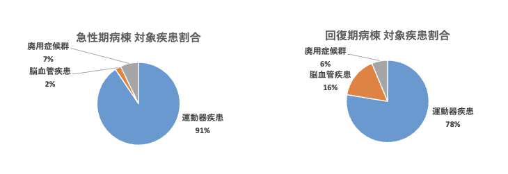 急性期病棟、回復期病棟とも運動器疾患が多い中、他院からは様々な疾病の患者さんが転院され、リハビリテーションを受けておられます。