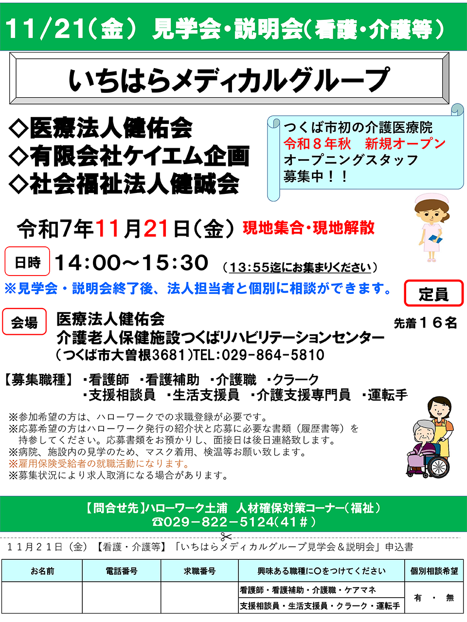 令和7年11月21日14:00〜15:30 医療法人健佑会、介護老人保険施設つくばリハビリテーションセンターにて見学会・説明会を行います。